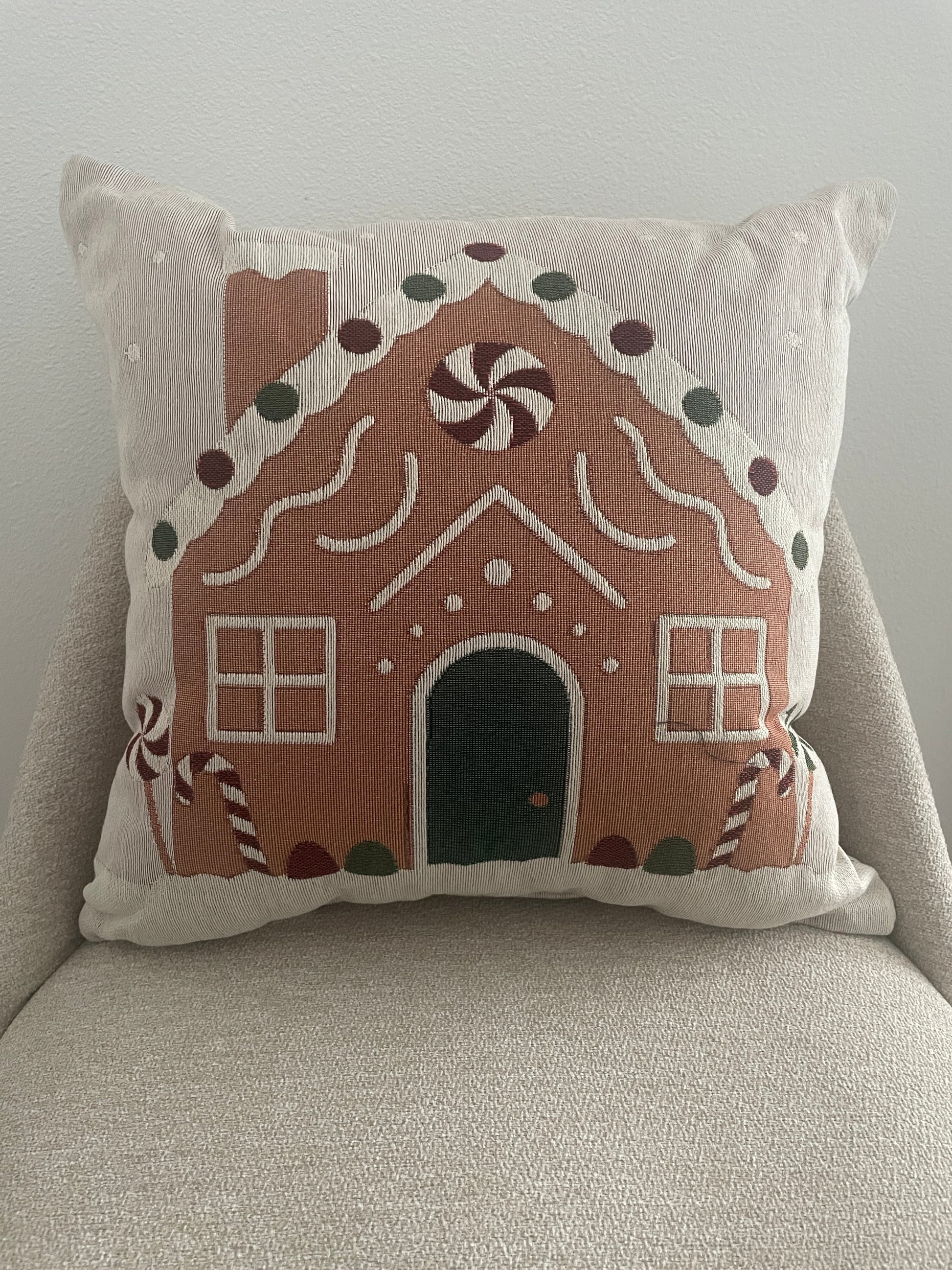 Gingerbread House Throw Pillow – Woven Christmas Holiday Accent Cushion